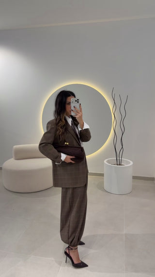 Checked suit from the brand MOCHY, consisting of a blazer and bombacha-style trousers. The trousers have an elastic waistband. The blazer is lined. The model is wearing size S.
