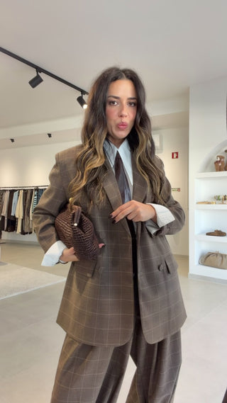 Fato da marca MOCHY, em xadrez composto por blazer e calça bombacha. Calça com elástico na cintura. Blazer forrado. A modelo vestiu tamanho S.