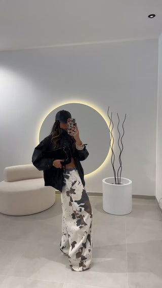 Calças com print vaca. Com efeito abalonado. Cintura subida.