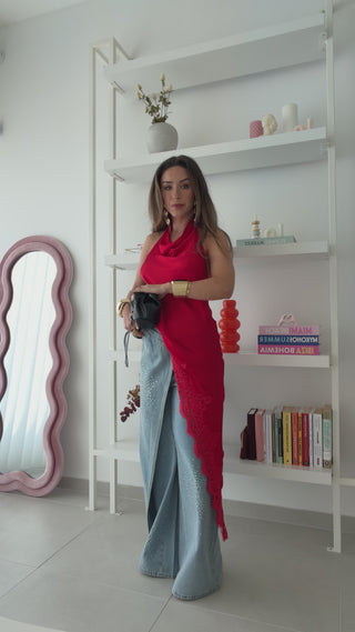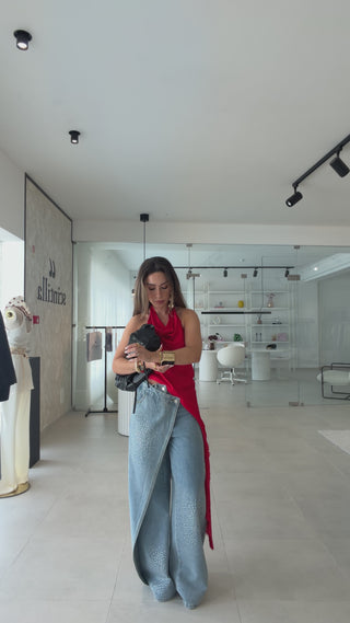 Jeans da MOCHY com brilhantes pregados e cintura cruzada.