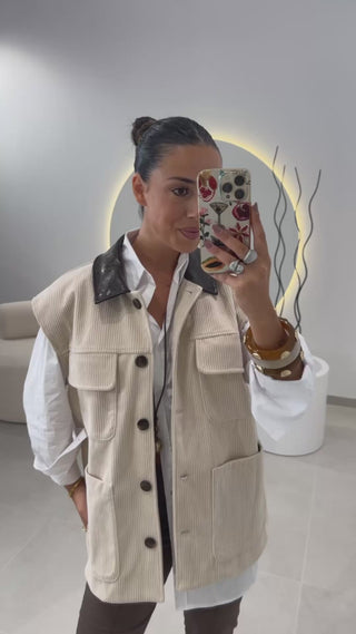 Colete oversize em bombazine, com bolsos na frente. Gola em castanho. Serve do S ao XL.