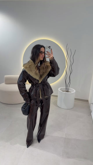 Casaco em ecopele com forro de pêlo. Marca LUMINA. A moselo vestiu tamanho SM.