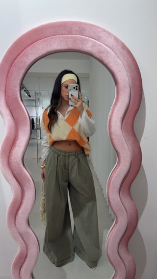 Colete de malha corte oversize, com camisa. Ambas as peças podem ser usadas em separado.