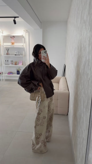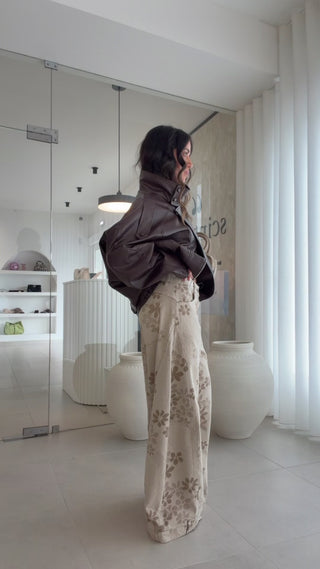 Jeans em tom bege, com flores castanhas. Cintura subida.