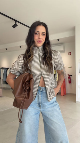 Blusa de manga curta, com padrão Vichy em castanho.