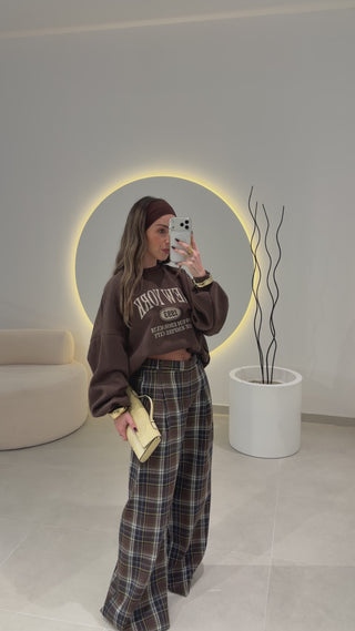 Calça wide leg em padrão de quadrados com detalhes azul marinho e amarelo.