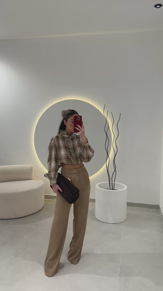 Calça clássica de alfaiataria na cor camel. Cintura subida.
