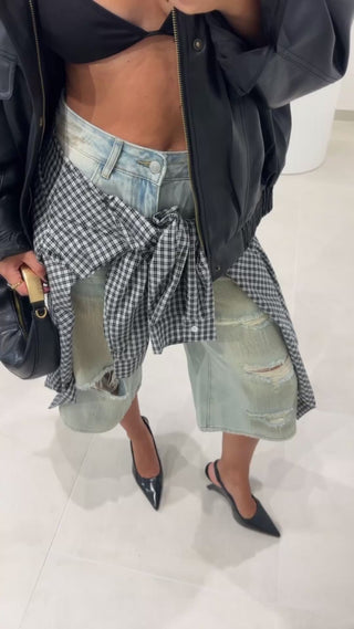 Bermuda de ganga, com efeito de rasgões na frente. Cintura subida.