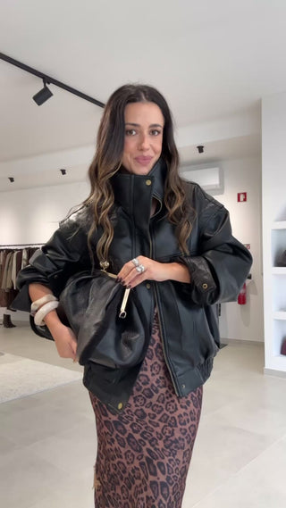 Vestido leopardo com corte assimétrico. Pormenor de renda ao tom.