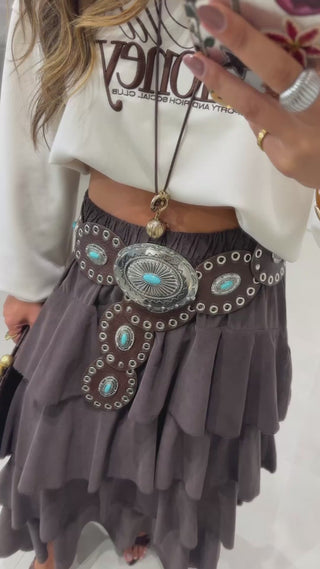 Cinto castanho maxi, com pormenores prateados e turquesa.