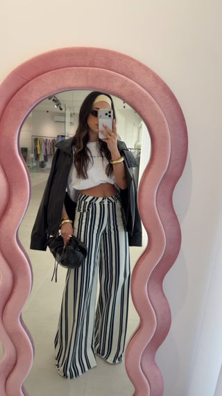 Jeans com elastano às riscas verdes e brancas, corte wide leg. A modelo vestiu tamanho SM.
