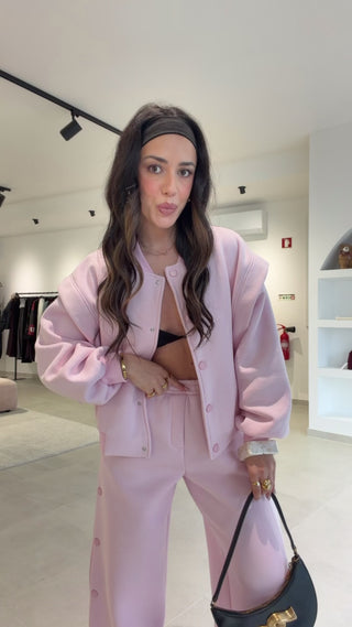 Bomber da marca Lumina, corte oversize. Com bolsos na frente, e botão de mola.