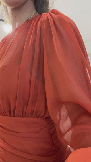 Flowy midi dress in terracotta with included lining. Features puff sleeves and ruffle detailing. Invisible zipper on the back. The model is wearing size S/M.
