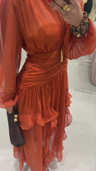 Vestido midi fluído na cor terracotta, com forro incluído. Manga abalonada. Aperta com fecho invisível atrás. Detalhe de folhos. A modelo vestiu tamanho SM.