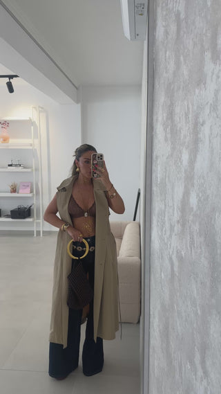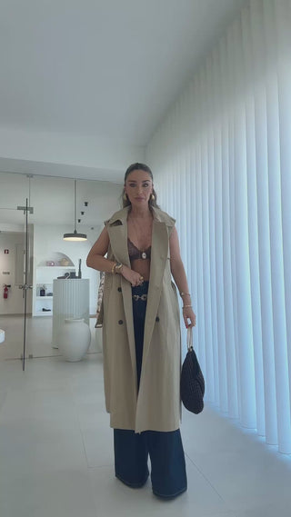 Sleeveless trench coat by the brand Lumina. Lining in pied-de-poule pattern. Wide belt and contrasting buttons. The model is wearing size SM.