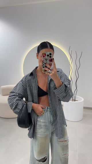 Camisa com padrão vichy a preto. Pormenor de botões na manga, para poder ser usada manga curta. Tem as 2 opções! Super trendy 🖤🪩