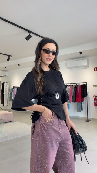 Jeans de cintura subida, de corte wide leg. Brilhos em toda a calça.